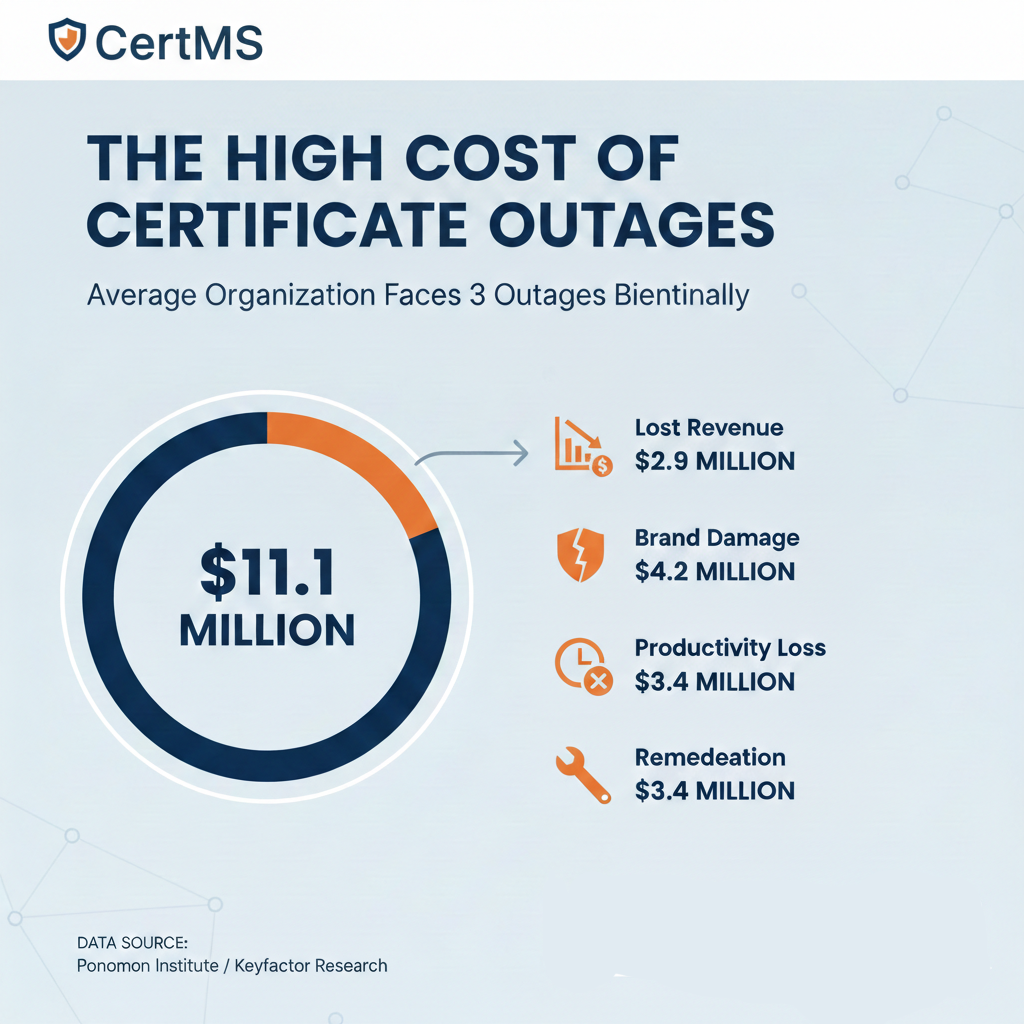 According to research from the Ponemon Institute and Keyfactor, the average organization experiences three certificate-related outages every two years. Each incident costs an estimated $11.1 million when you factor in: